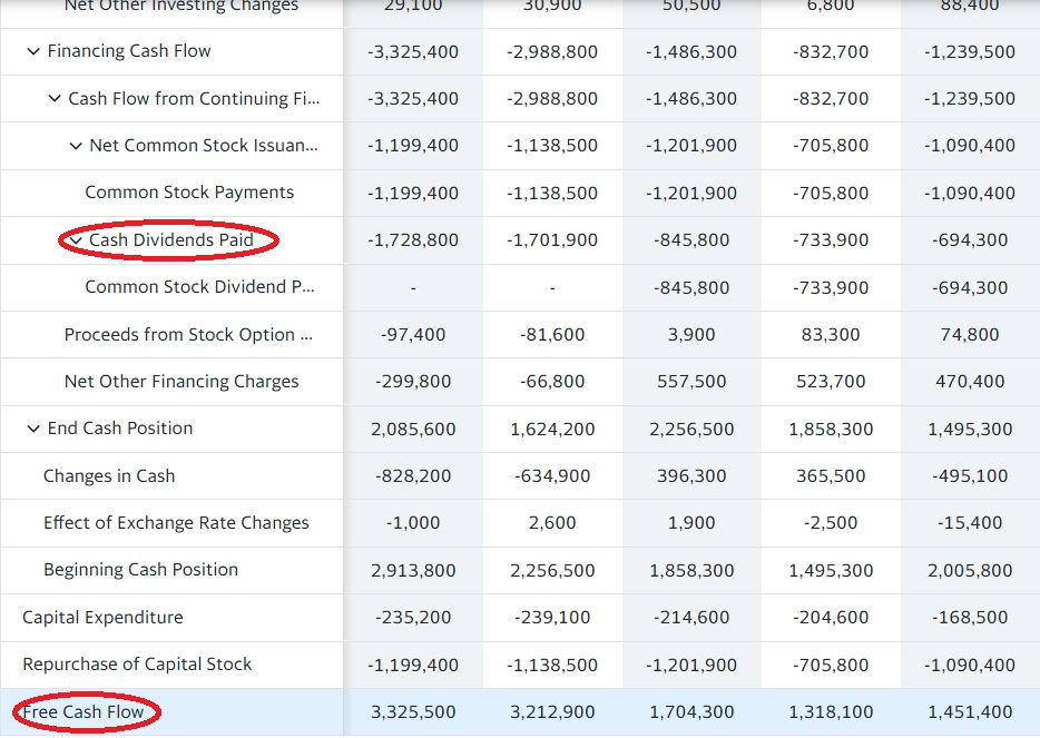 Those two metrics we will need to calculate the Payout ratio on the dividend! I compare this always to the Free cash flow. Most companies pay their dividends out from the Free Cash Flow. I want to make sure that they have enough from that and the paid dividends aren’t higher than the Free Cash Flows 75%.